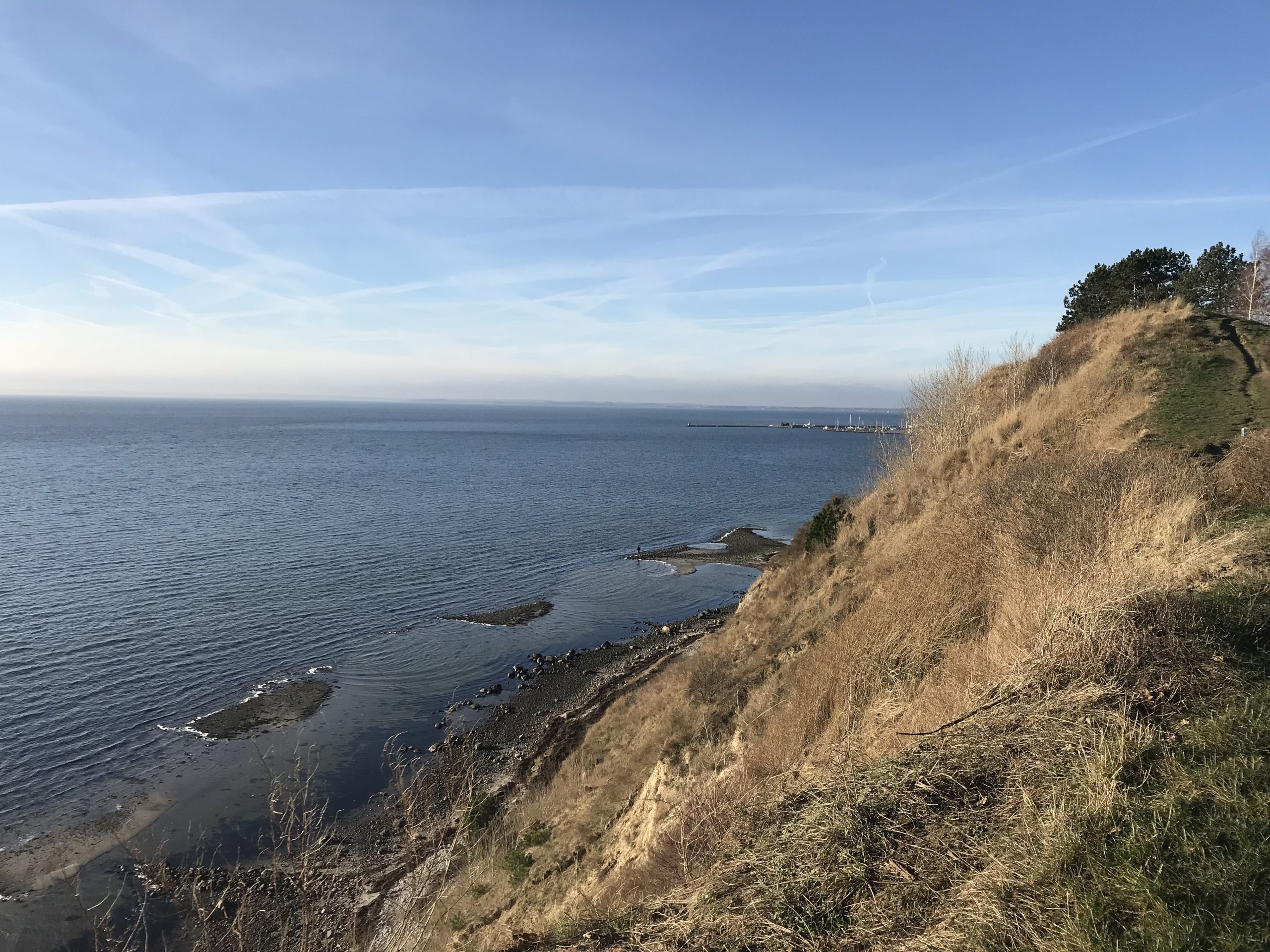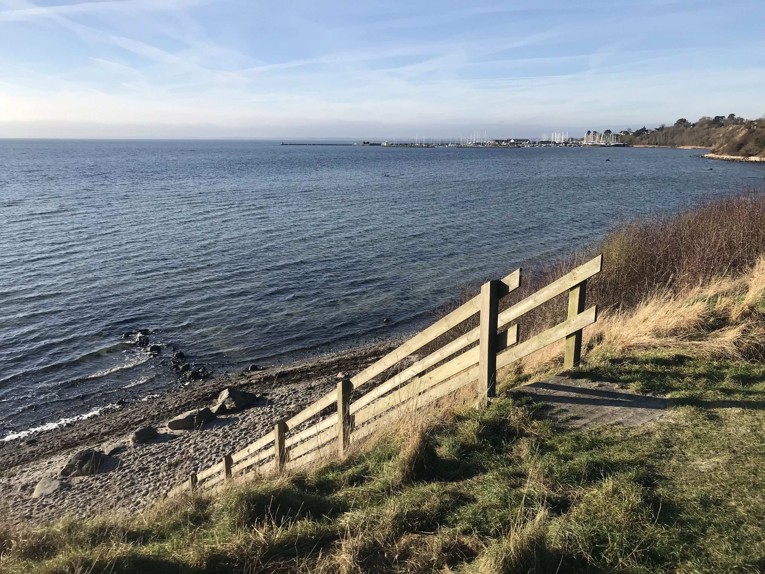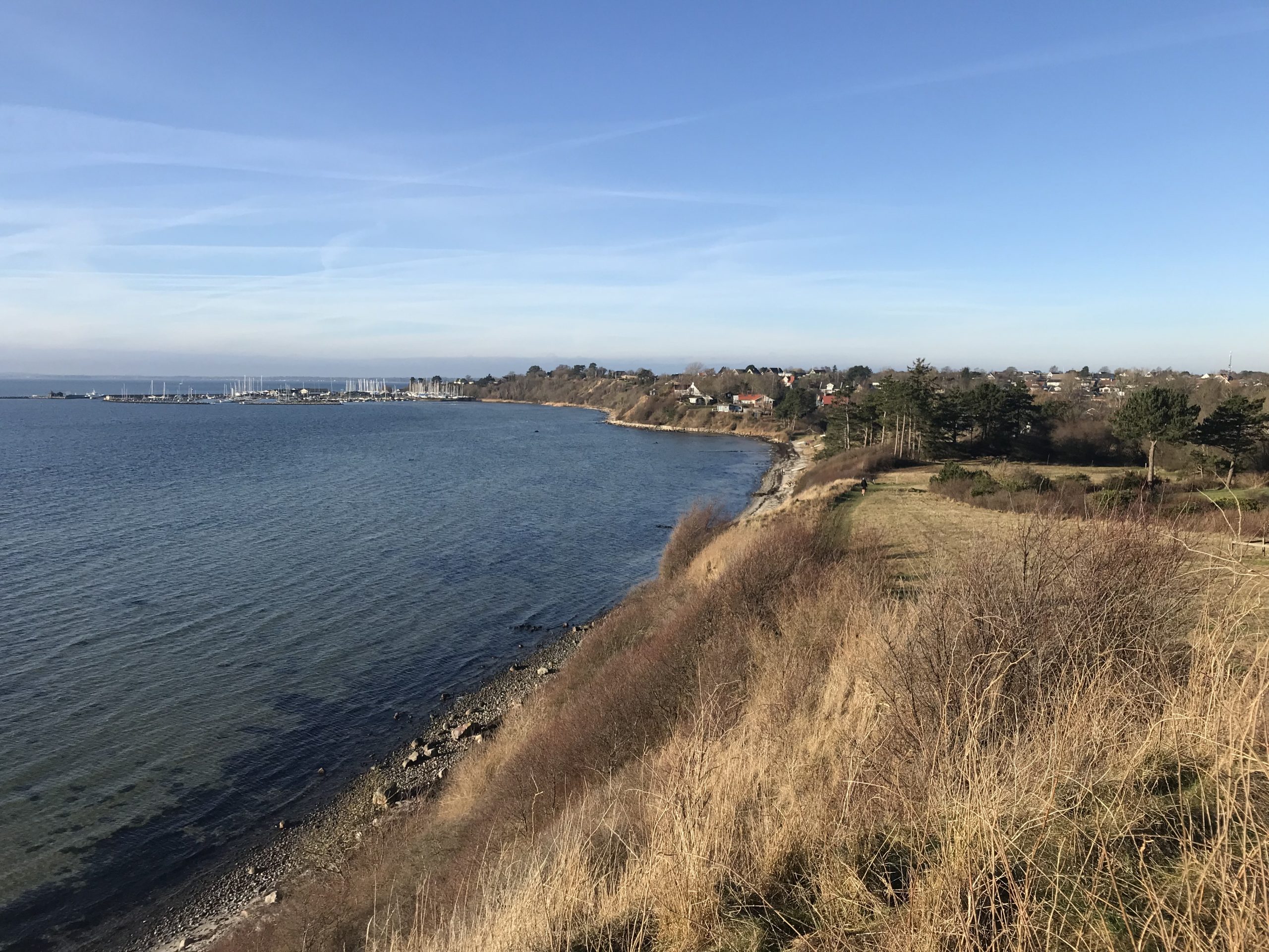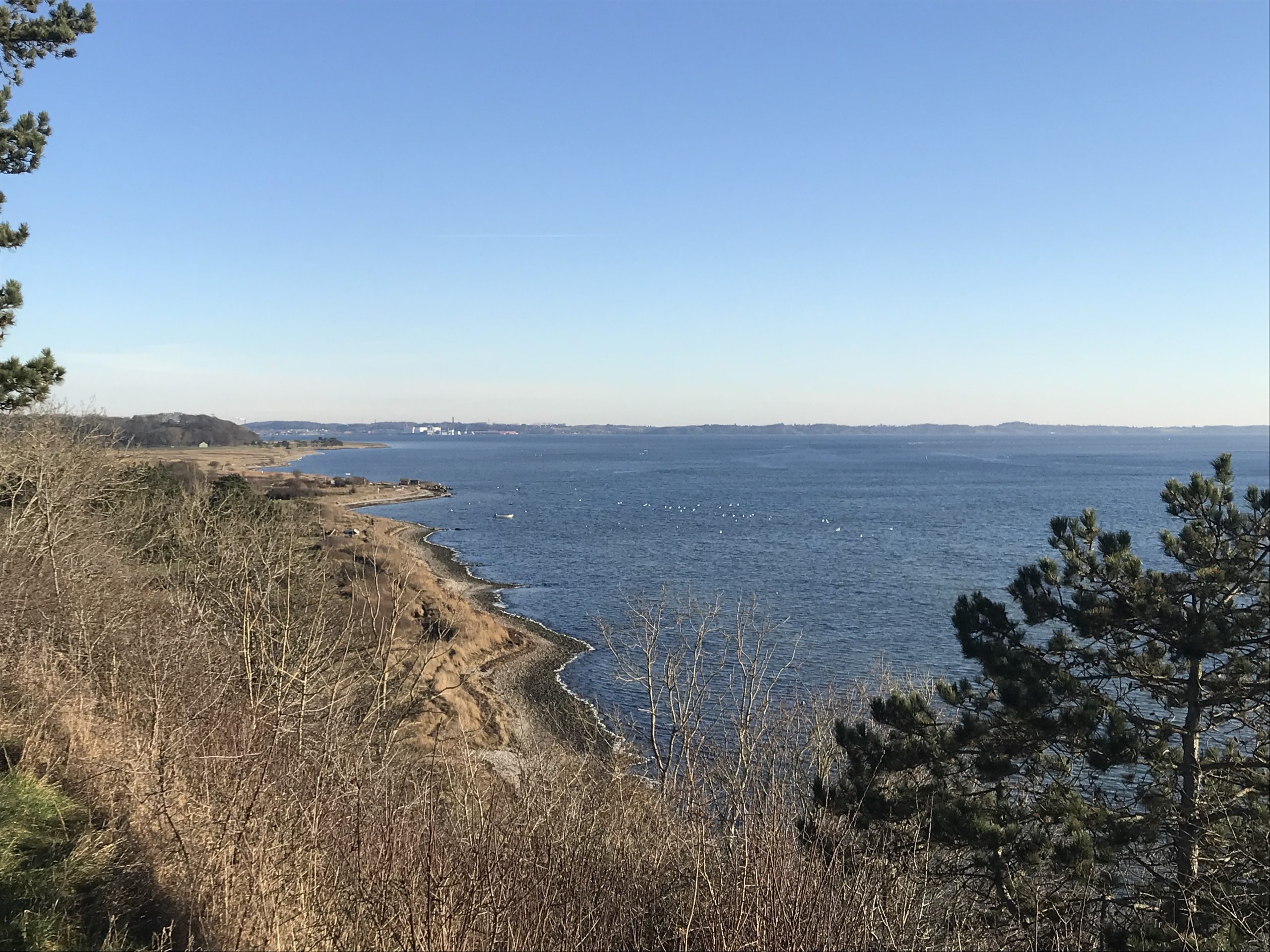 View from beginning of Store Karlsminde Cliffs in direction east to Sølager Ferry Berth at left and to Roskilde Fjord: