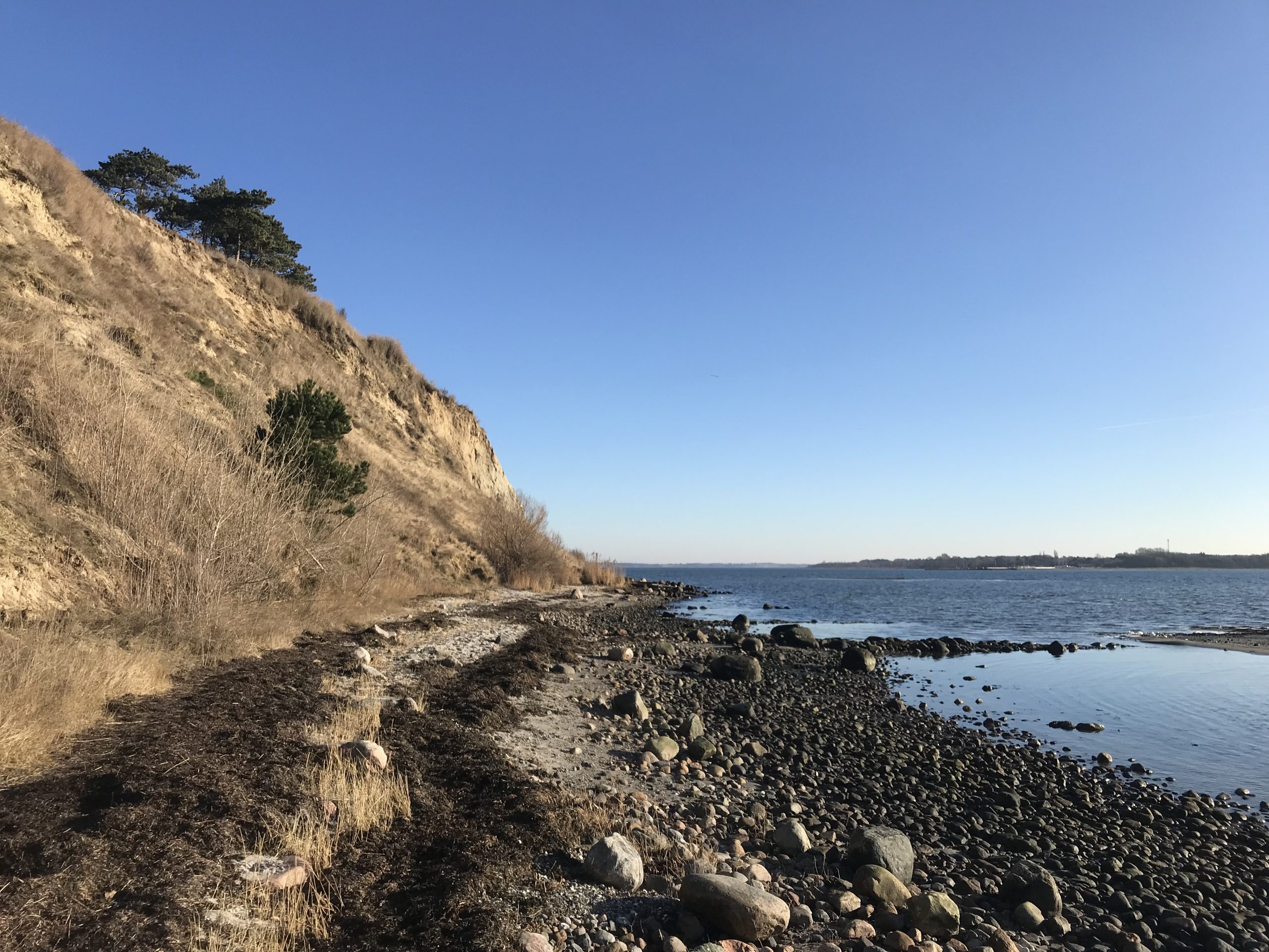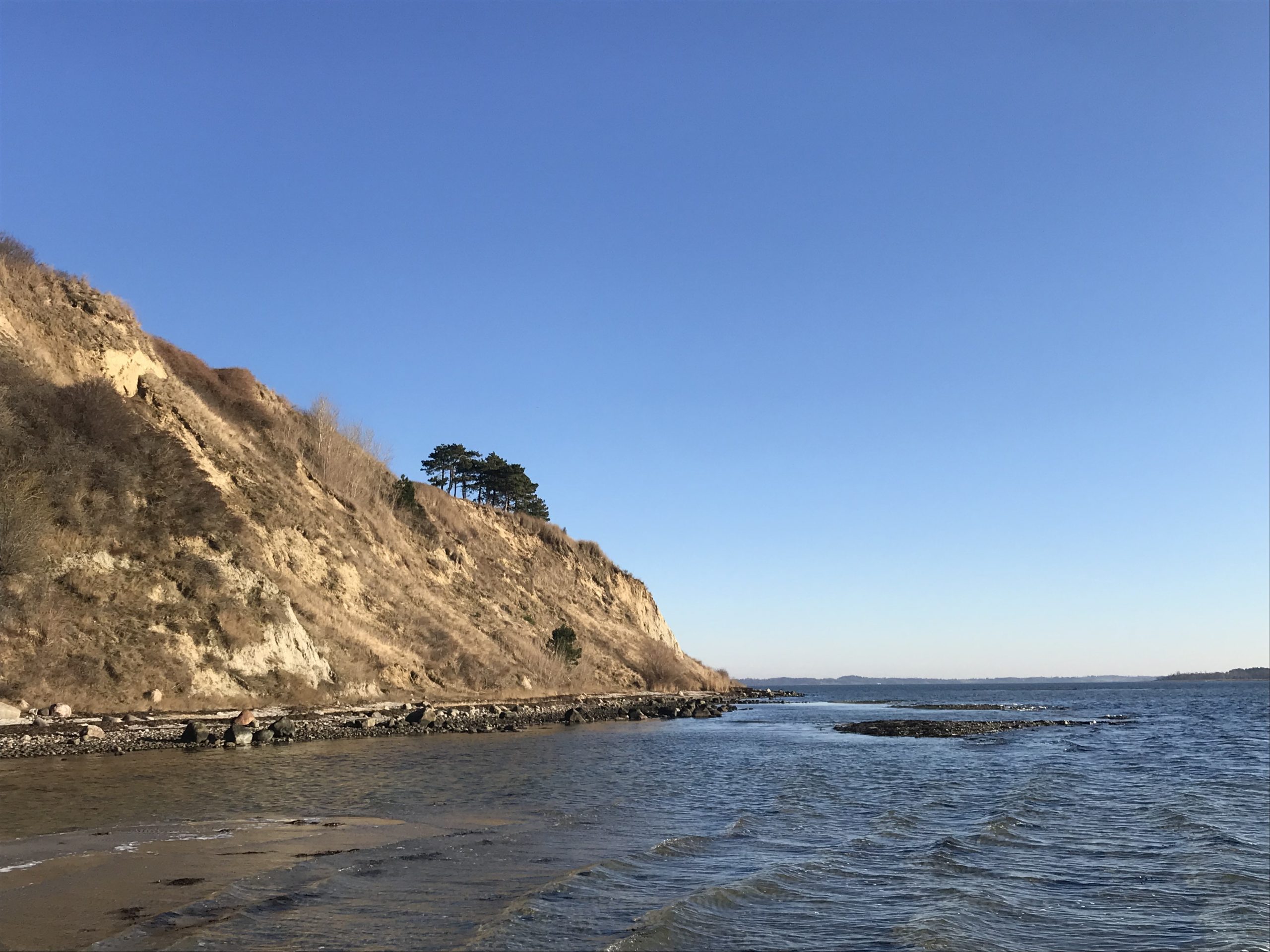 View in direction north of coast of Roskilde Fjord at Store Karlsminde Cliffs: